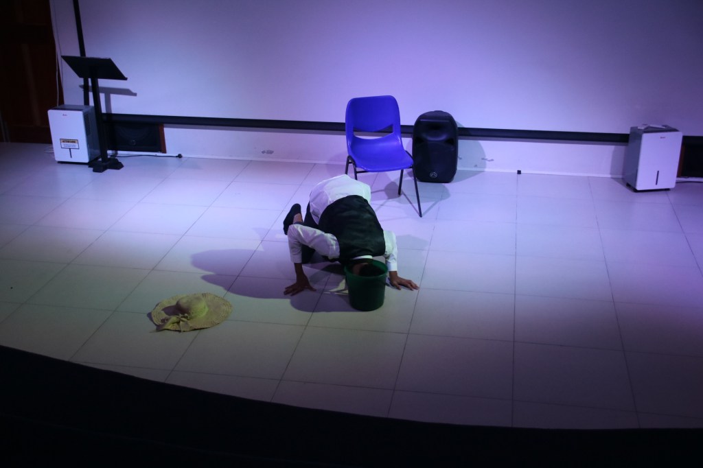 The elements of the monologue were meant to make little sense as well. The staging and set design was meant to be as minimalist as possible, which I found to be similar to Noh Theatre, another practice in which the elements of the play are also minimal in order to put emphasis on the actors. As a result the set only had a bucket, and a chair on stage, and it was up to the audience to decide where the story takes place as the setting is not directly referenced in the solo piece. This also affected the lighting of the act, as often the lights accompany what is shown in the scene. The lighting was hence kept white to keep the focus of the scene onto the monologue itself. No sound effects were also used for the same reason, as was the use of no make up in the show. The costume was decided to be a suit as that could be a general set of clothing that may also be unusual to the audience.